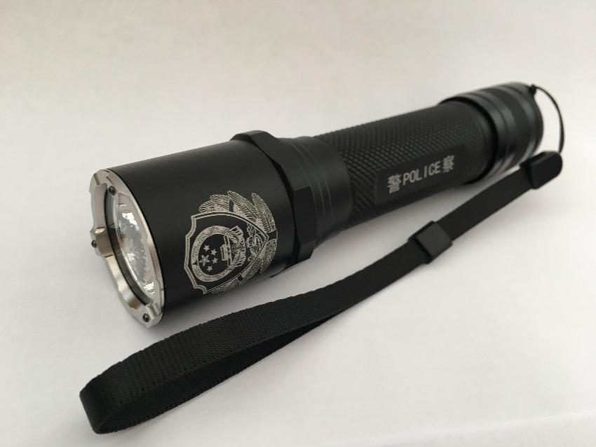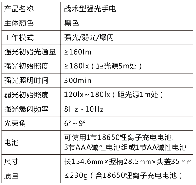 战术型强光手电由手电主体、电池、挂绳、充电附件等组成。产品为尾盖开关,适用于特警、刑警等配合战术动作使用。