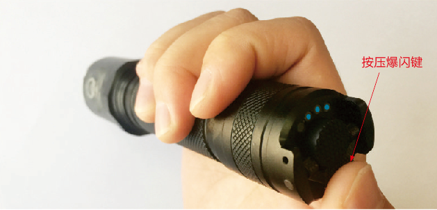 强光爆闪:手电在任何状态下(待机、强光、弱光),按压爆闪键,直接进入爆闪模式,再次按压爆闪键,爆闪停止,恢复原工作状态(待机、强光、弱光)。