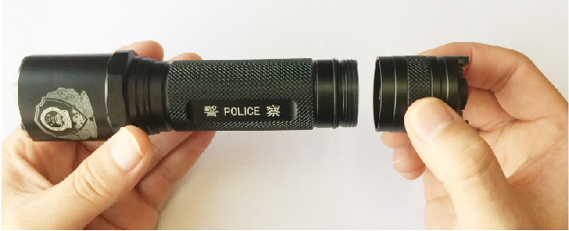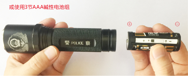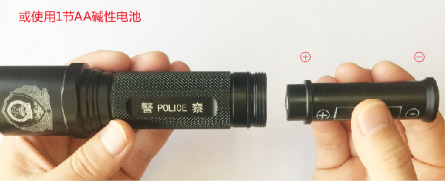 AA电池正极朝内放入筒身。(注意:使用AAA电池或AA电池
